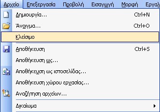 Για να κλείσουμε το τρέχον Βιβλίο Εργασίας, επιλέγουμε την εντολή "Κλείσιμο" από το Menu "Αρχείο".