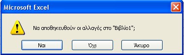 Σε περίπτωση που το αρχείο δεν έχει αποθηκευτεί καθόλου, ή έχουν προκληθεί αλλαγές στο περιεχόμενό του οι οποίες δεν έχουν αποθηκευτεί, τότε ο μηχανισμός του Excel, μας ειδοποιεί με κατάλληλο μήνυμα και μας ρωτά αν θέλουμε να προβούμε σε αποθήκευση.