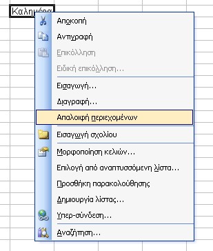 Εναλλακτικά μπορούμε να ενεργοποιήσουμε το κελί και να πατήσουμε επάνω του δεξί κλίκ. Στη συνέχεια επιλέγουμε την εντολή "Απαλοιφή Περιεχομένων" και τα περιεχόμενα του κελιού θα διαγραφούν.