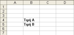 Πληκτρολογούμε τις λέξεις Τιμή Α και Τιμή Β σε δύο από τα κελιά του Φύλλου Εργασίας. Οι λέξεις αυτές θα χρησιμεύσουν ως ετικέττες και θα χρησιμοποιηθούν για τη δημιουργία ενός πιό ευανάγνωστου Φύλλου.
