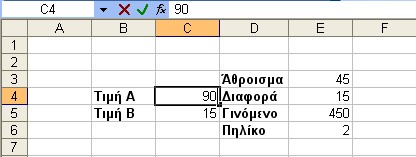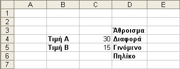 Πληκτρολογούμε τις δύο ακέραιες τιμές (έστω 30 και 15) στα δεξιά γειτονικά κελιά (C4 και C5 αντίστοιχα) από τις ετικέττες που βάλαμε στο Βήμα 2.