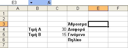 Ξεκινάμε τη διαδικασία της πρόσθεσης. Τοποθετούμε τον δείκτη του ποντικιού στο κελί δεξιά από την ετικέττα του Αθροίσματος (Ε3) και το ενεργοποιούμε.
