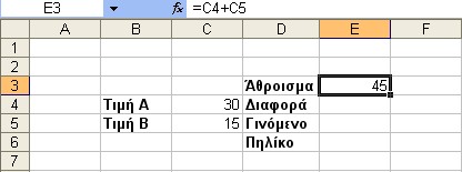 Πληκτρολογούμε τον τύπο =Β4+Β5 και πιέζουμε Enter. Μπορούμε εναλλακτικά να χρησιμοποιήσουμε και τη μέθοδο Point & Click.