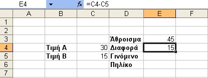 Συνεχίζουμε με τη διαδικασία της Αφαίρεσης. Τοποθετούμε τον δείκτη του ποντικιού στο κελί δεξιά από την ετικέττα της Διαφοράς (Ε4) και το ενεργοποιούμε. Στη συνέχεια πληκτρολογούμε τον τύπο =C4-C5 και πιέζουμε Enter. Μπορούμε εναλλακτικά να χρησιμοποιήσουμε τη μέθοδο Point & Click.