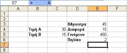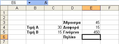 Συνεχίζουμε με τη διαδικασία του Πολλαπλασιασμού. Τοποθετούμε τον δείκτη του ποντικιού στο κελί δεξιά από την ετικέττα του Γινομένου (Ε5) και το ενεργοποιούμε. Πληκτρολογούμε τον τύπο = C4*C5 και πιέζουμε Enter. Μπορούμε εναλλακτικά να χρησιμοποιήσουμε τη μέθοδο Point & Click.