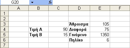 Πληκτρολογούμε τις λέξεις Άθροισμα, Διαφορά, Γινόμενο και Πηλίκο σε αντίστοιχα κελιά. Οι λέξεις αυτές θα χρησιμοποιηθούν ως ετικέττες για τον ίδιο λόγο.