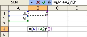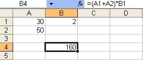Αν για παράδειγμα θέλουμε να προσθέσουμε τα περιεχόμενα του κελιού Α1 με τα περιεχόμενα του κελιού Α2 και το αποτέλεσμα να το πολλαπλασιάσουμε με τα περιεχόμενα του κελιού Β1 τότε θα πρέπει να γράψουμε : =(Α1+Α2)*Β1.