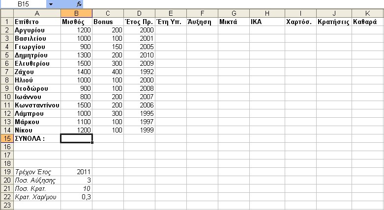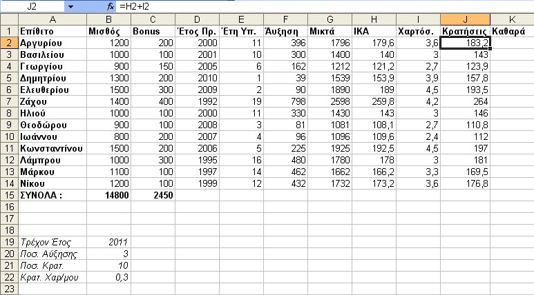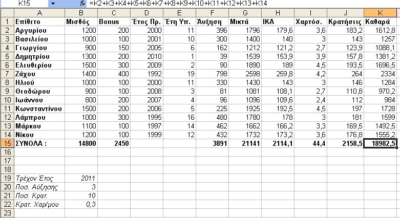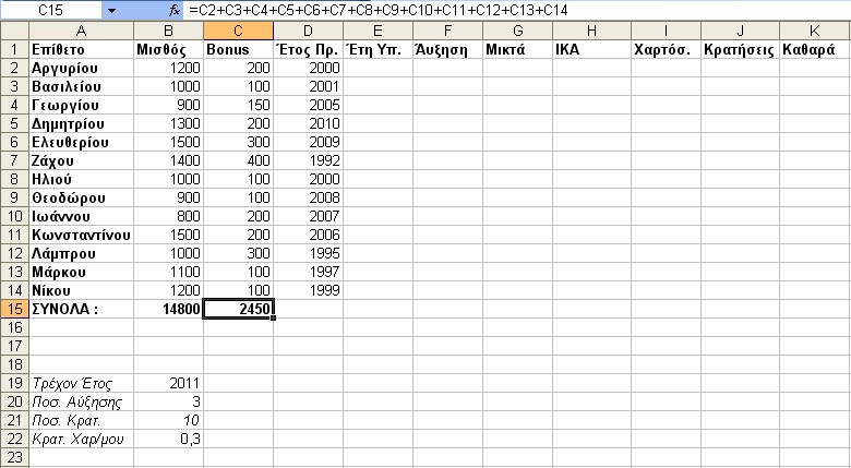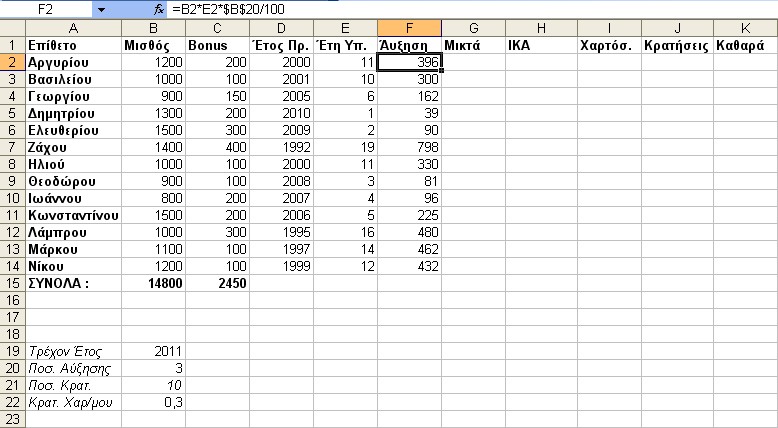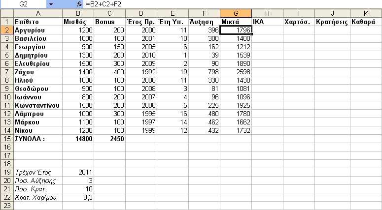 Υπολογίζουμε τις Μικτές Αποδοχές κάθε υπαλλήλου (Μισθός + Bonus + ¶υξηση).