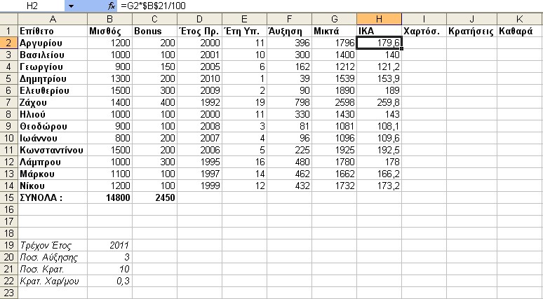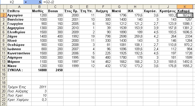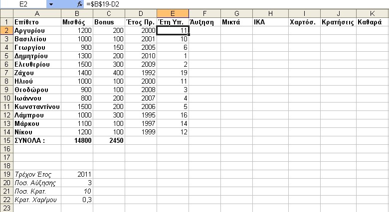 Για κάθε υπάλληλο, υπολογίζεται αύξηση 3% επί του Βασικού Μισθού για κάθε έτος υπηρεσίας (θεωρούμε ότι το τρέχον έτος είναι το 2011 από το οποίο και αφαιρούμε το έτος πρόσληψης, για να υπολογίσουμε τα έτη υπηρεσίας).