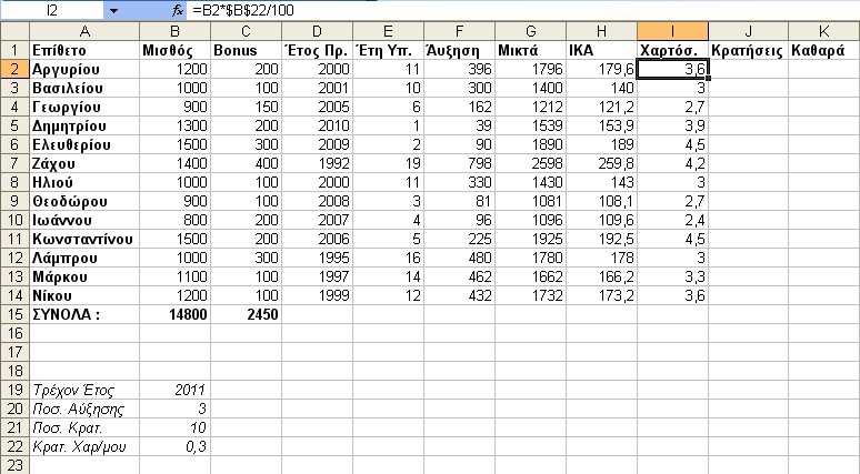Υπολογίζουμε την αύξηση κάθε υπαλλήλου, πολλαπλασιάζοντας τον Βασικό Μισθό με 3% για κάθε Έτος Υπηρεσίας και μεταφέρουμε τον τύπο.